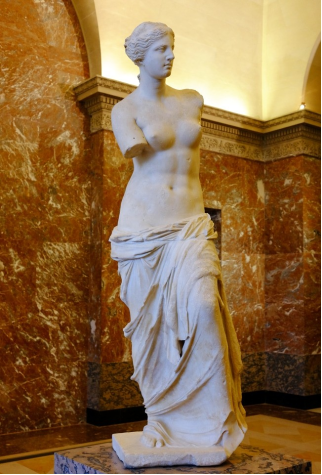 大約公元前4世紀時,希臘著名的雕刻家阿海山納在神話的基礎上加以想象和創造,用大理石雕成了這一藝術珍品,但后來遺失了。1820年在密羅斯島上,重新發現,現存法國盧浮宮,與勝利女神像和達芬奇的蒙娜麗莎畫并稱為"盧浮宮三寶"。