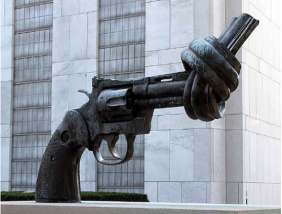 位于聯合國總部大廈入口處,由盧森堡政府贈送的,彎曲打結的槍管表示了人們對非暴力的向往。