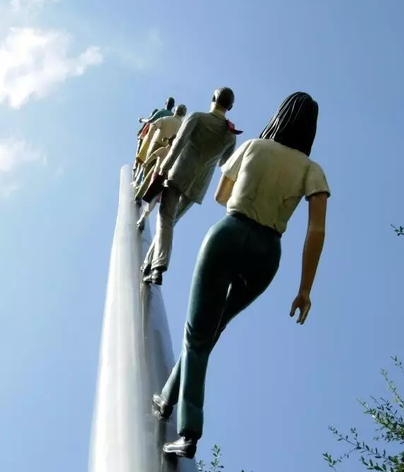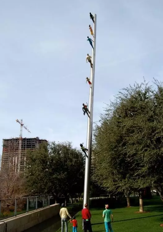 2004年秋天在洛克菲勒中心下沉廣場一側(cè),離《普羅米修斯》雕塑不遠(yuǎn)處,出現(xiàn)了一件大型公共藝術(shù)裝置作品,這是喬納森·博羅夫斯基創(chuàng)作的《走向天空》,是由洛克菲勒中心委托設(shè)計(jì),并由公眾藝術(shù)基金贊助的。裝置重達(dá)7噸,描述了一行七人正秩序井然地在100英尺高的不銹鋼柱上向著天空行走的場景,其中有不同年齡、不同性別、不同種族、不同職業(yè)的人,他們正打破地心引力,走向人類不可企及的新空間。巨大的不銹鋼柱傾斜75度角插入洛克菲勒中心高樓環(huán)抱的廣場空地,向著東方,極為壯觀,形成一種與垂直城市空間相適應(yīng)的公共藝術(shù)空間形式。同時(shí)喬納森在地面上還安排了三個(gè)人在仰望這一行人,形成了一種場景式的公共藝術(shù)。廣場所有觀看者都不由自主地進(jìn)入情境之中,抬頭仰望,面向天空,陷入沉思,人們的視線停留在這行人行走的終點(diǎn),視乎看到了未來,明白了人類的潛力和極限。這件《走向天空》的公共藝術(shù)作品在2005年被轉(zhuǎn)移到德可薩斯達(dá)拉斯納希爾雕塑中心,今天在世界上還有兩件復(fù)制品,一件在賓夕法尼亞匹茲堡的卡內(nèi)基梅隆大學(xué)校園內(nèi),另一件在韓國漢城禾谷東的一個(gè)商業(yè)大樓前。