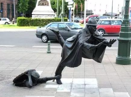 1、《捉弄警察的叛逆少年》,位于比利時布魯塞爾市中心不遠的圣約翰廣場。藝術家Tom Frantzen作品,表現的是一名調皮的少年從下水道中鉆出抓住了警察的一只腳。